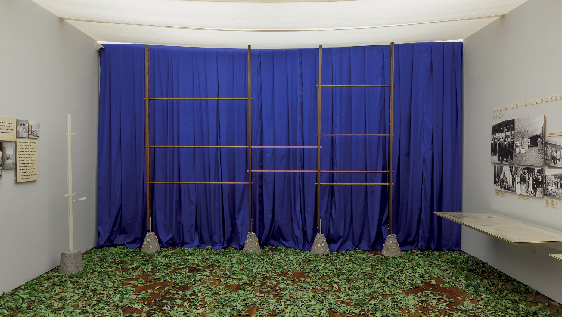 For this show held at Museu da Casa Brasileira, we inverted the common sense logics of object on a base / visitor on the ground we see on most exhibitions. Instead, we created a sort of wood carpet, that guides the visitor through the shows, creating spaces and a trajectory for the visitor to walk on. The colors were picked from the prolific tapestry work by Jean Gillon.