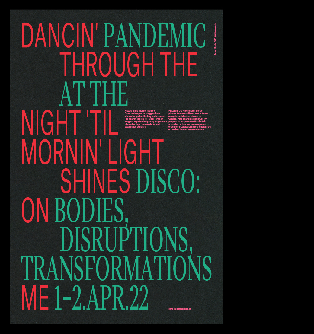 For the 27th edition of one North America’s longest running student-driven history conferences at Concordia University in Montréal, we took inspiration from the event’s titular epochs of disco and pandemic. Paying tribute to the lyrics of disco diva Sylvester (himself one of the towering creative figures tragically lost to the HIV/AIDS crisis) and the text-driven protest posters of ACT UP’s Montréal chapter, this series extended across digital print postering runs, silkscreened mementos for keynotes and panelists, a fully coded website featuring a Sylvester playlist and motion graphics for online promotion.